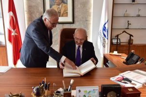 13. Cumhurbaşkanı Adayı Kemal Kılıçdaroğlu, Başkanlık anı defterini imzalarken; Başkan Gökhan da konukları 13. Cumhurbaşkanı Adayı Kemal Kılıçdaroğlu, Ankara Büyükşehir Belediye Başkanı Mansur Yavaş ve İstanbul Büyükşehir Belediye Başkanı Ekrem İmamoğlu’na hediye takdiminde bulundu.