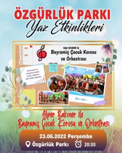 “Özgürlük Parkı Yaz Etkinlikleri”ne başlayan Bayramiç Belediyesi, parkta kurulan sahnede bu hafta “Alper Bakiner ve Çocuk Korosu”nu konuk edecek.
