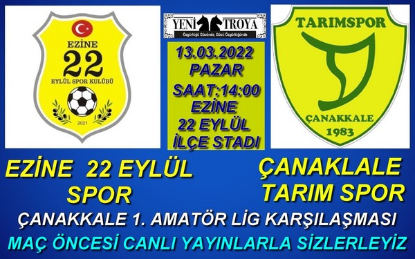 Ezine 22 Eylül İlçe Stadında 12 Mart Pazar günü oynanacak müsabaka saat ; 14.00’de başlayacak.