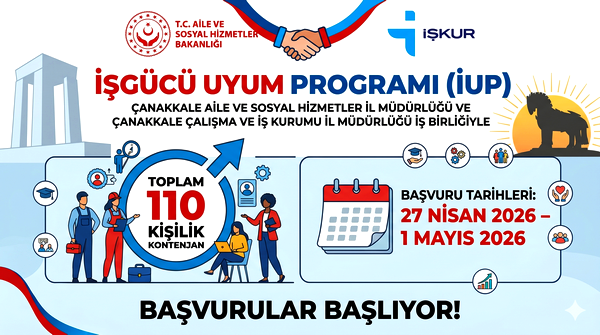 Çanakkale Çalışma ve İş Kurumu (İŞKUR) İl Müdürlüğü ile Çanakkale Aile ve Sosyal Hizmetler İl Müdürlüğü arasında imzalanan iş birliği protokolüyle, toplam 110 kişiye yönelik İşgücü Uyum Programı (İUP) düzenleneceği duyuruldu. Kamusal alanların temizliği, bakım ve onarımı gibi kritik görevlerde yer alacak katılımcılar için başvuru süreci bugün itibarıyla başladı.