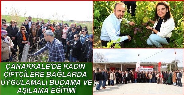 Çanakkale’de kadın çiftçilere yönelik uygulamalı eğitimler devam ediyor. Bu kapsamda Çanakkale’de kadın çiftçilere “Çanakkale Bağlarından Sofraya Yemeklik Asma Yaprağı” projesi kapsamında uygulamalı budama ve aşılama eğitimi verildi.