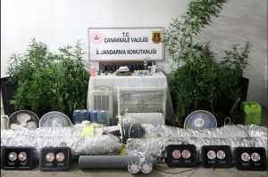 “Çanakkale İl Jandarma Komutanlığı ekipleri tarafından uyuşturucu madde imal ve ticareti suçu kapsamında Ayvacık ilçesinde, uyuşturucu madde yetiştirildiği tespit edilen bir eve 07.09.2022 günü düzenlenen operasyonda, 67 kök kenevir bitkisi, 12 kök skunk, 75 gr. esrar maddesi, 5 gr. kenevir tohumu, 2 adet hassas terazi, 1 adet video kamera, 4 adet ph ölçer cihazı, muhtelif miktarda aydınlatma, havalandırma, ısıtma ve yalıtım malzemesi ele geçirilmiştir.