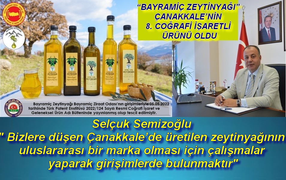 “İlimiz coğrafyasında üretilen birçok tarım ürünü, katma değeri yüksek ürün olma potansiyeli barındırmaktadır. Çanakkale’de üretilen zeytinyağımız da ulusal ve uluslararası alanlarda markalaşmaya en uygun tarım ürünleri arasında yer alıyor. Bayramiç Ziraat Odamızın girişimleri ve Odamızın destekleriyle İlimizin 8. Coğrafi İşaretli Ürünü olan “Bayramiç Zeytinyağı” bugün itibariyle tescil edildi. Bizlere düşen bundan sonra Çanakkale’de üretilen zeytinyağının uluslararası bir marka olması için çalışmalar yaparak girişimlerde bulunmaktır. Bayramiç Zeytinyağı Tescil çalışmalarında başta Bayramiç Ziraat Odası Başkanı İsmail Pehlivan olmak üzere emeği geçen herkese teşekkür ediyorum.”
