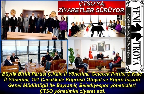 Göreve yeniden seçilen Çanakkale Ticaret ve Sanayi Odası Yönetim Kurulu Başkanı Selçuk Semizoğlu ve yönetimine hayırlı olsun ve tebrik ziyaretleri devam ediyor. Bu kapsamda Büyük Birlik Partisi Çanakkale İl Yönetimi, Gelecek Partisi Çanakkale İl Yönetimi, 191 Çanakkale Köprüsü Otoyol ve Köprü İnşaatı Genel Müdürlüğü ile Bayramiç Belediyespor yöneticileri ÇTSO Yönetim Kurulu Başkanı T. Selçuk Semizoğlu ve yönetimine ziyaret gerçekleştirdi.