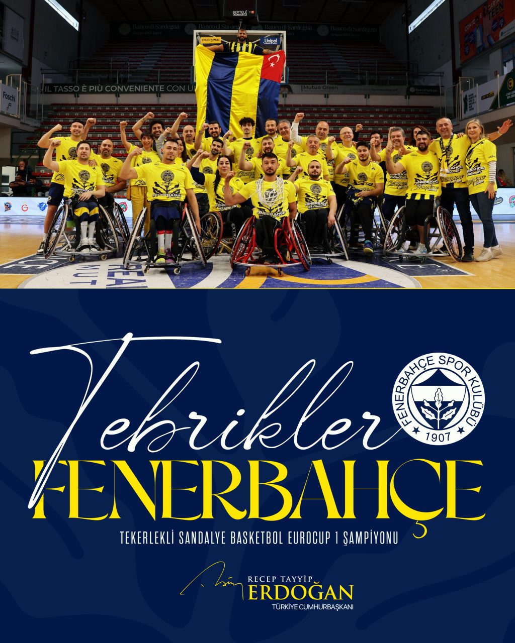“Tekerlekli sandalye basketbol branşında EuroCup 1 şampiyonu olan Fenerbahçe İstanbul Jet Takımımızı, oyuncularını, teknik heyetini ve tüm Fenerbahçe camiasını gönülden tebrik ediyorum.”