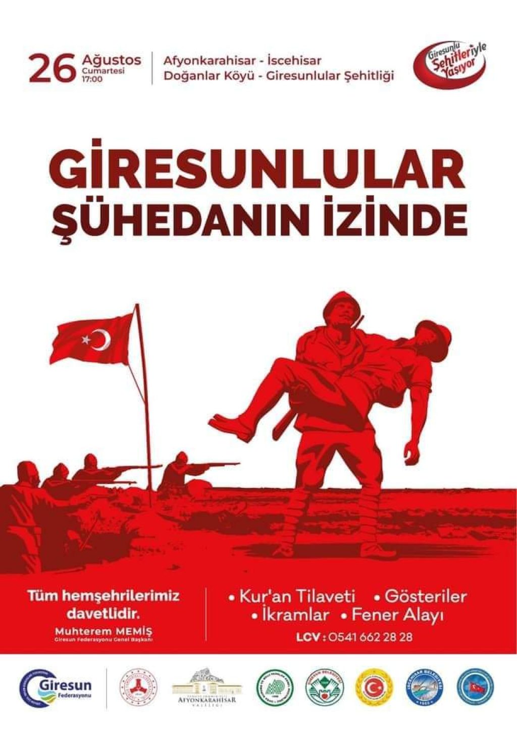 Giresun Federasyonu 26 Ağustos Cumartesi Afyonkarahisar İscehisar İlçesi Doğanlar Köyünde bulunan Giresun Şehitliği anma programına Giresunluları ve Giresun dostlarını davet etti. Anma programına Giresun ve Afyon milletvekilleri, belediye başkanları, bürokratlar siyasetçiler, sivil toplum kuruluşları ve üst düzey devlet protokolünün de katılması bekleniyor.