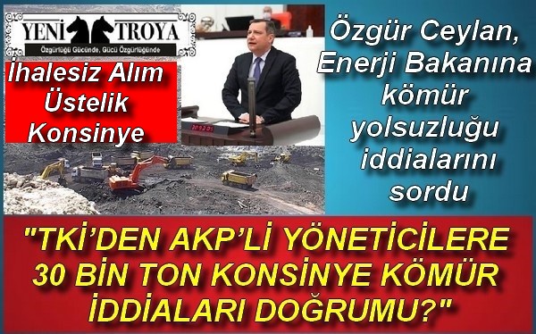 Özgür Ceylan T.K.İ Çan Linyitleri İşletmesi Müdürlüğü’nden düzenli aralıklarla kömür alanlar arasında AKP Çanakkale il yöneticilerinin de olduğu yönünde iddialar bulunduğunu belirtirken, “Şayet doğru ise hangi AKP’li yönetici ya da onun sahibi veya ortağı olduğu şirket bugüne kadar hangi aralıklarla kurumdan ne kadar kömür almıştır? Bir AKP il yöneticisinin kurumdan 30.000 ton toz kömür aldığı iddiaları doğru mudur? Söz konusu binlerce tonluk kömür alımları ihalesiz mi yapılmıştır? Kuruma ödemelerini hangi tarihlerde, yapmıştır?”diye sordu. Özgür Ceylan, son dört yıldır satışı yapılan linyit kömürü ve toz kömür bedellerinden tahsil edilemeyen ve biriken alacak tutarları hakkında bilgi isterken, “Söz konusu satışlar dolayısıyla alınması gereken tahsil edilemeyen bedeller dolayısıyla kurum zarara uğramış mıdır? Geciken tahsilatlar ile ilgili olarak ilgili kömür satış sözleşmelerinin yaptırımlara ilişkin hükümleri kurum tarafından uygulanmış mıdır? Şayet uygulanmadı ise neden sözleşmelerdeki yaptırımlara ilişkin hükümler devreye sokulmamıştır?” diye sordu.
