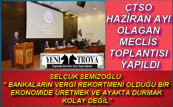 Çanakkale Ticaret ve Sanayi Odası Haziran ayı olağan Meclis Toplantısı ÇTSO Kongre Fuar Merkezinde yapıldı. Yönetim Kurulu Başkanı Selçuk Semizoğlu toplantıda yaptığı konuşmada; “Bankaların vergi rekortmeni olduğu bir ekonomide üretmek ve ayakta durmak kolay değil” dedi.