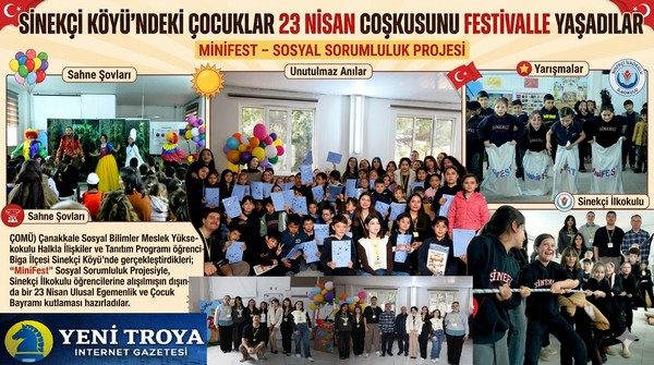 Çanakkale Onsekiz Mart Üniversitesi (ÇOMÜ) Çanakkale Sosyal Bilimler Meslek Yüksekokulu Halkla İlişkiler ve Tanıtım Programı öğrencileri, Biga İlçesi Sinekçi Köyü’nde gerçekleştirdikleri; “MiniFest” Sosyal Sorumluluk Projesiyle, Sinekçi İlkokulu öğrencilerine alışılmışın dışında bir 23 Nisan Ulusal Egemenlik ve Çocuk Bayramı kutlaması hazırladılar.