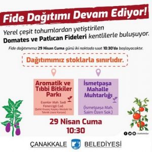 Çanakkale Belediyesi tarafından yerel tohumlardan üretilen fideler kentliler ile buluşturulmaya devam ediyor. Çanakkale Belediyesinden yapılan duyuruda ; "29 Nisan 2022...